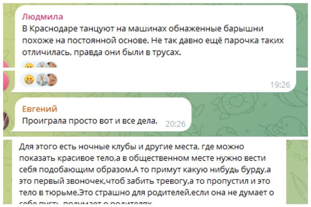 В центре Краснодара девушка без комплексов сняла с себя платье и стала танцевать на капоте "Мерседеса". Знойную танцовщицу не смущали на проезжавшие мимо авто, ни пешеходы."На улице Красной, оседлав капот чёрного "Мерседеса", обнажённая гурия выплясывает различные па. Ночным гулякам явно зашло-публики собралось достаточно для столь позднего часа", - отмечается в публикации местного Телеграм-канала "ЧП Краснодар".После того как видео появилось в соцсетях к девушке проявили интерес правоохранители. "За совершенные действия ей грозит административная ответственность по статье 20.1 КоАП РФ (Мелкое хулиганство), предусматривающей вплоть до 15 суток ареста", - предупредили в МВД.Вскоре появилась информация, что личность нарушительницы спокойствия установлена. 30-летняя жительница Краснодара отказалась от медосвидетельствования, за что получила административный протокол. Еще один был составлен за мелкое хулиганство.Поскольку девушка танцевала на чужом авто, правоохранители проводят проверку из-за повреждённого имущества.В соцсетях к перфомансу девушки отнеслись по-разному. Одни были довольны нежданным зрелищем и не понимали, что такого ужасного в поступке незнакомки. Другие возмущались, что этот инцидент скажется на родителях и других родственниках любительницы "грязных танцев". Им-то каково будет смотреть в глаза окружающим?!