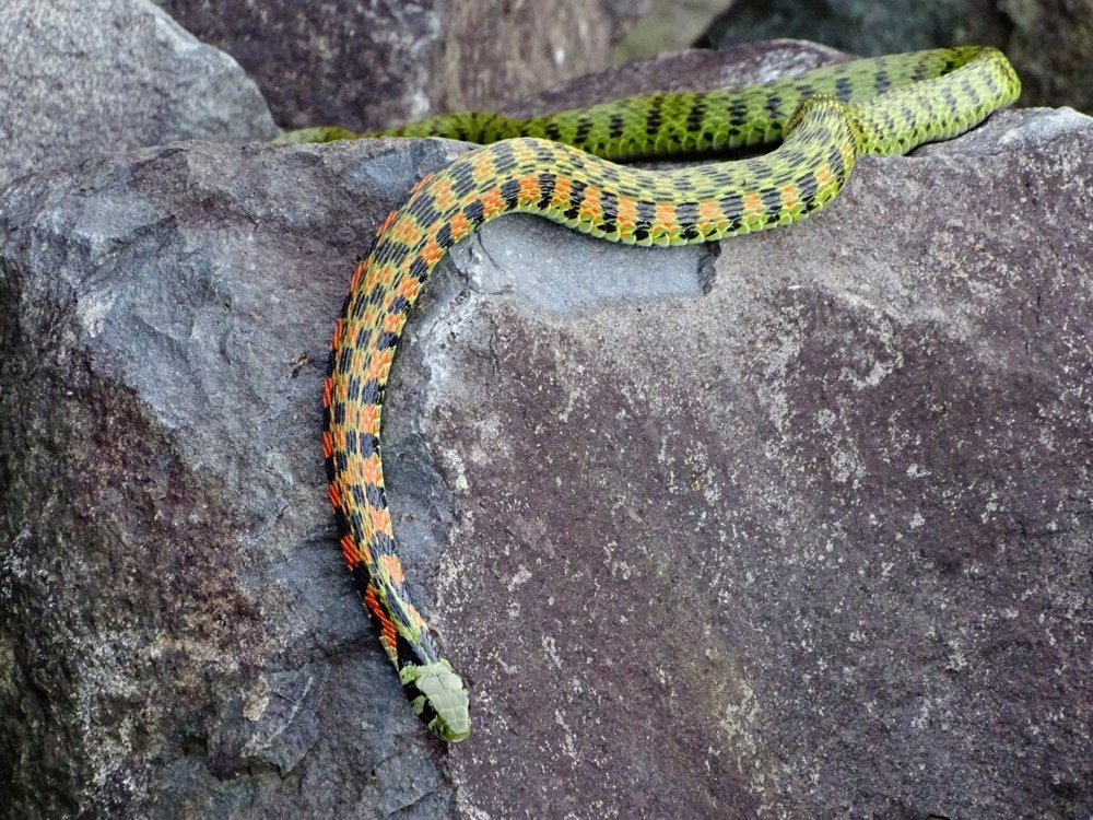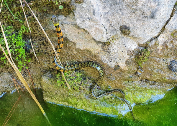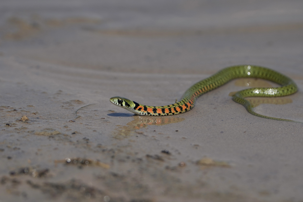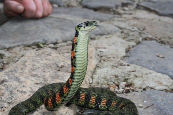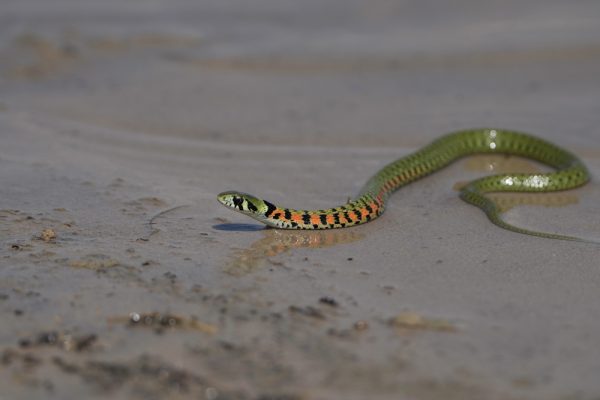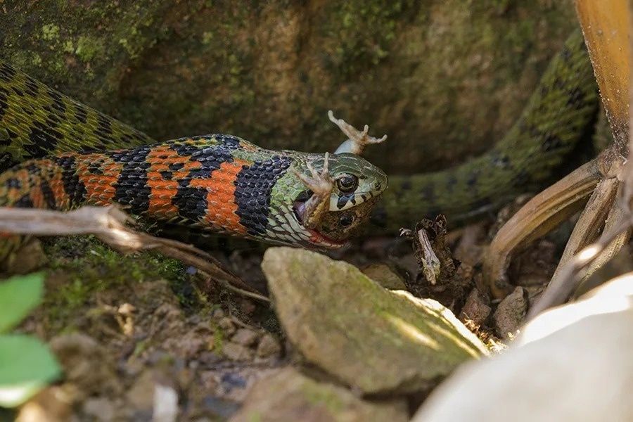 Тигровый уж - азиатский родственник ужа обыкновенного. Живет на Дальнем Востоке, в Китае, Японии, Корее. От привычной нам змейки он отличается кардинально. Будучи крохотной рептилией - не больше метра - он не боится окружающих. Тигровый уж делает так, чтобы окружающие трепетали перед ним! Оливково-зелёный наряд в чёрную полоску становится ярко-оранжевым ближе к голове. Уж не пытается слиться с местностью. Он заявляет: я тут, и я крут. Держись от меня подальше! Такой манифест вполне оправдан, ведь тигровый уж - рептилия дважды ядовитая.
