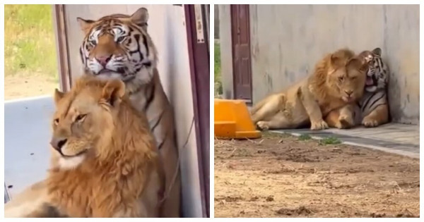 Тигр очень любит своё личное пространство, но лев, видимо, любит его гораздо больше.