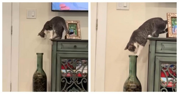 Кота заинтересовали пробки в большой бутылке и он попытался их достать. В какой-то момент пушистый зверь допустил ошибку.