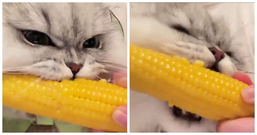 Домашний кот с большим удовольствием ест кукурузу.