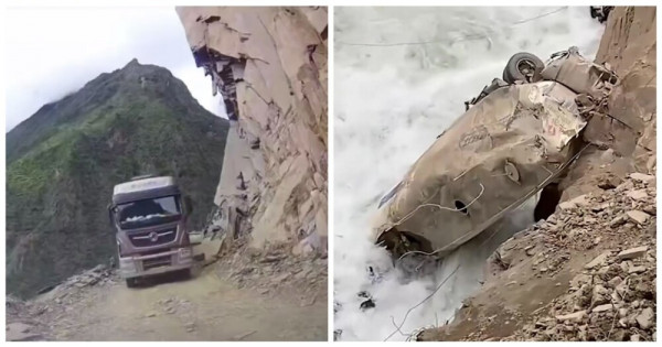Автоцистерна упала в реку. На сравнительно коротком отрезке до деревни Чавалонг, как пишут, насчитывается более 150 участков с камнепадами и три горных перевала, где постоянно лежит снег.