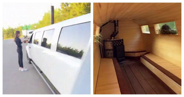 Мужчина запечатлел первую в мире баню-лимузин. Машина внутри обшита деревом и оборудована так, чтобы можно было попариться в небольшой компании.