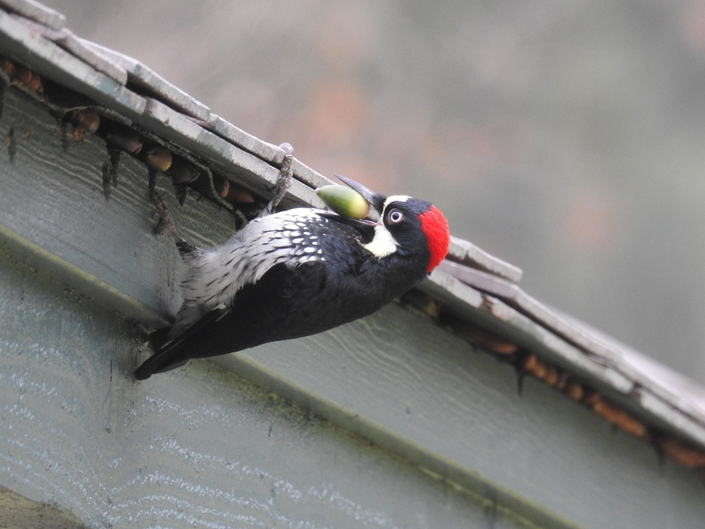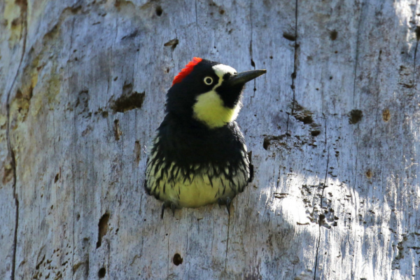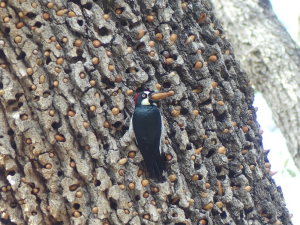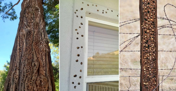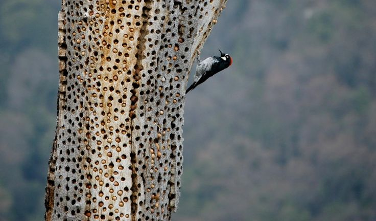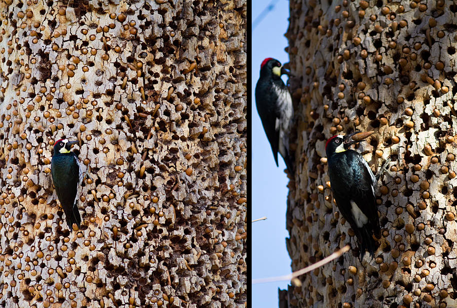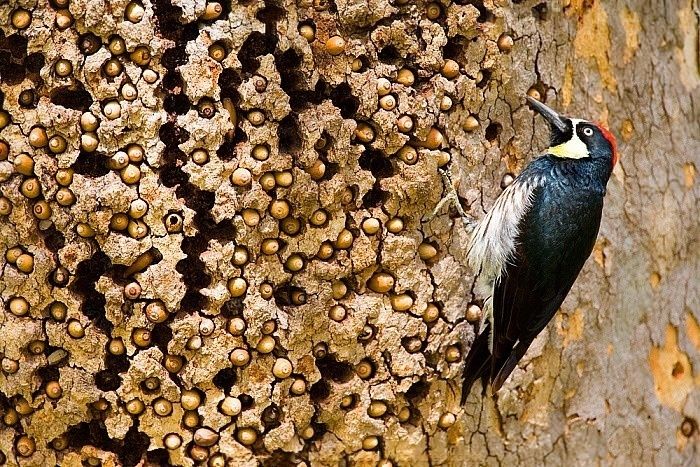 Кстати, о кладовых. Это визитная карточка желудёвых дятлов. Представьте: огромное старое дерево, в котором выдолблены десятки тысяч маленьких дырочек, и в каждой дырочке спрятан жёлудь. Самые большие деревья насчитывают до 60 000 желудей! Настоящий ад для трипофоба. Чтобы выдолбить одно такое отверстие, у дятла уходит до 20 минут. Кланы птиц поколениями долбят дырочки на своих деревьях!