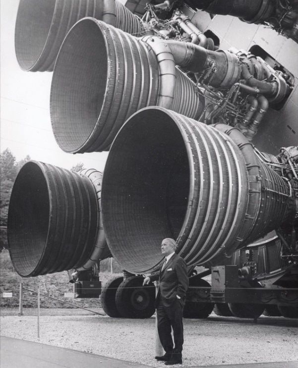 Уорнер фон Браун рядом с двигателями ракеты "Сатурн-5", использовавшейся для лунных миссий "Аполлон".