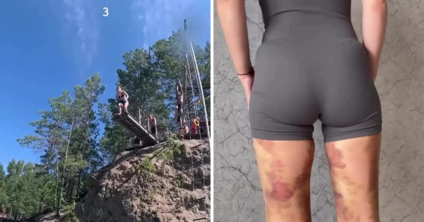 Девушка прыгнула с высокой точки вертикально в воду. Результат - сильные ушибы ягодиц и наглядная демонстрация опасности прыжков без правильной техники.