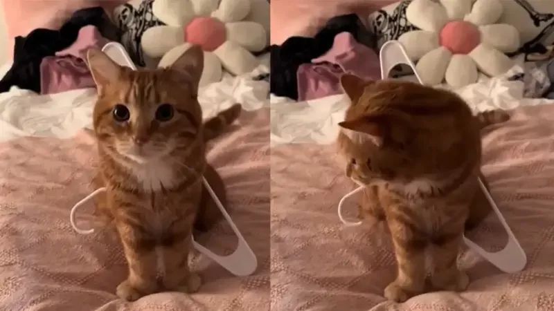 Кот вместо паники решил полностью принять случившееся. С царственным видом он продемонстрировал свой новый модный "образ", будто конструкция стала частью его стиля.Спокойный взгляд и гордая осанка котейки превратили неловкий момент в демонстрацию кошачьего достоинства. Его невозмутимое поведение стало идеальным примером того, как можно с честью выйти из положения, даже когда ты умудрился застрять в вешалке как последний дуралей.