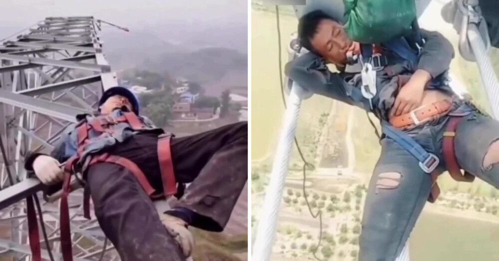 В Китае монтажники линий электропередачи устраивают «тихий час» прямо на опорах на большой высоте