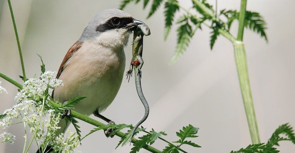 Знакомьтесь, сорокопут. Эта хищная птица накалывает свою добычу на шипы колючих растений или другие острые предметы, чтобы потом удобнее её есть или делать запасы.