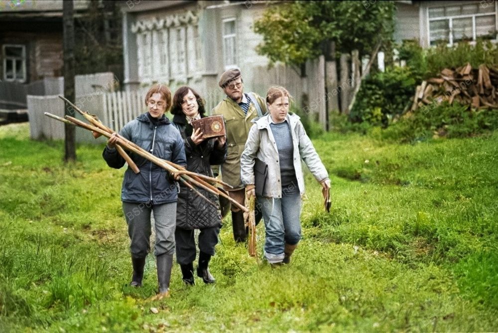 Научные сотрудники музея во время сбора предметов деревенского быта. Деревня Овинищи Гороховецкого района Владимирской области, 1987 год.