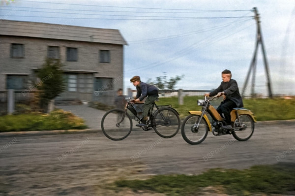 Наперегонки на велосипедах/мопедах по улице села. Колхоз "Новая жизнь" Щёкинского района Тульской области, 1969 год.