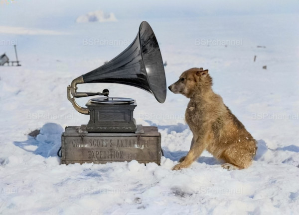 Ездовая собака и граммофон. Экспедиция Terra Nova, 1910-1913 год.