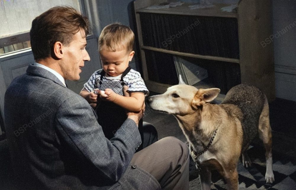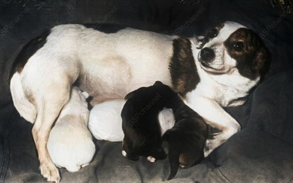 Собака-космонавт Стрелка со своим вторым потомством, 1962 год.