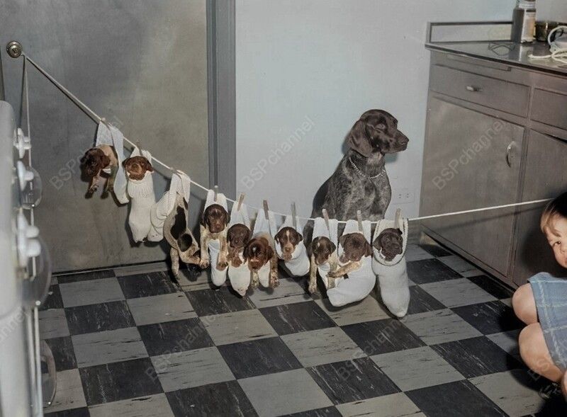Щенки сушатся на веревке, 1960-е.