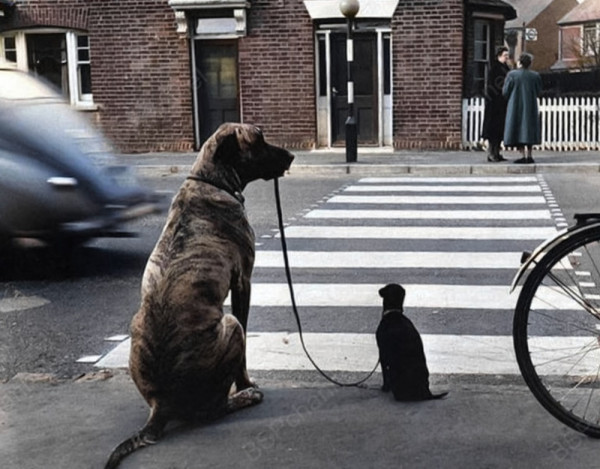 Немецкий дог держит поводок своего меньшего товарища, пока они ждут на обочине дороги во время занятий по дрессировке собак, проводимых дрессировщиком собак Барбарой Вудхаус. Великобритания, 1954 год.