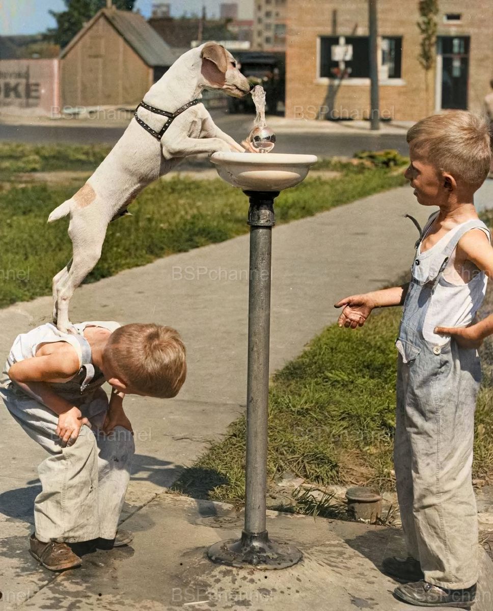 Мальчик помогает своему другу напиться воды. Висконсин, США, 1940-е.