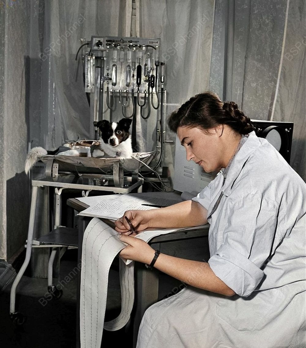 Физиолог Ада Котовская готовит собаку Лайку к полету на 2-м искусственном спутнике Земли. Он состоялся 3 ноября 1957 года.