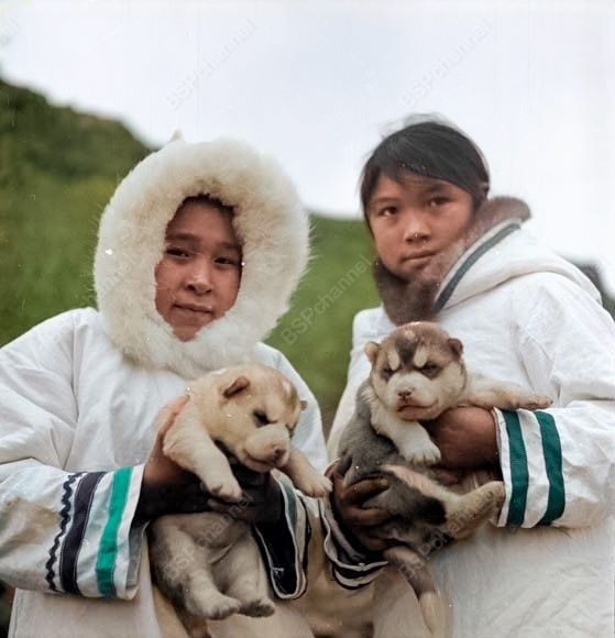 Две девочки-инуитки (эскимосы) с щенками на руках. Север Канады, 1951 год.