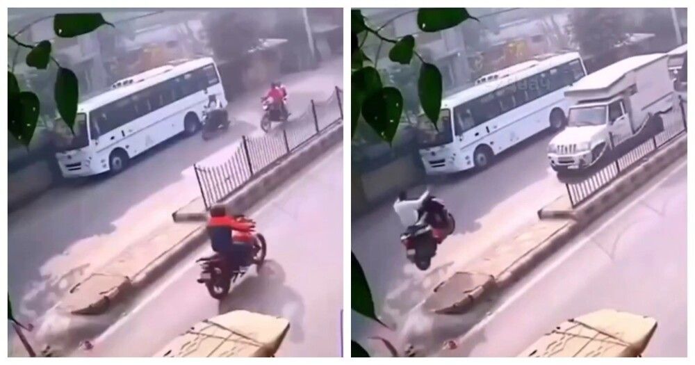 Камера наблюдения, установленная около дороги в индийском населённом пункте, запечатлела ДТП с участием скутера и автомобиля. Словно сцена из болливудского фильма!