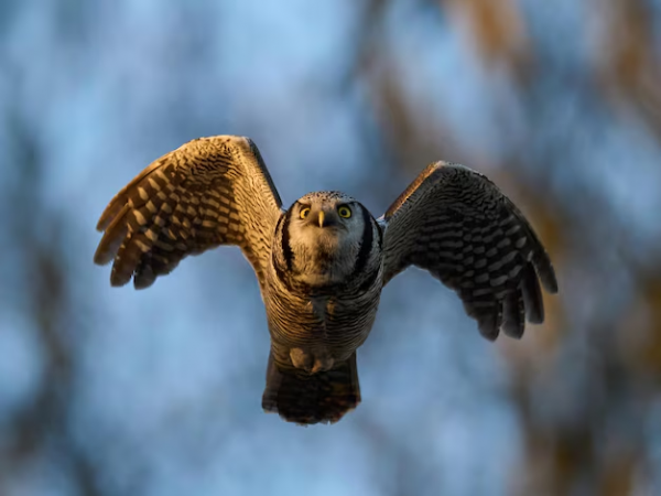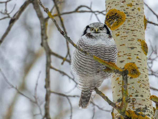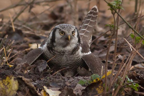 С первого взгляда сову в ястребиной сове и не признаешь. Окрас в серо-белую пестринку в точности повторяет камуфляж дневных хищников. Ярко-желтые глаза по сравнению с окулярами сородичей - крохотные. Тело плотное и сбитое, пусть и небольшое - всего 300 грамм веса.