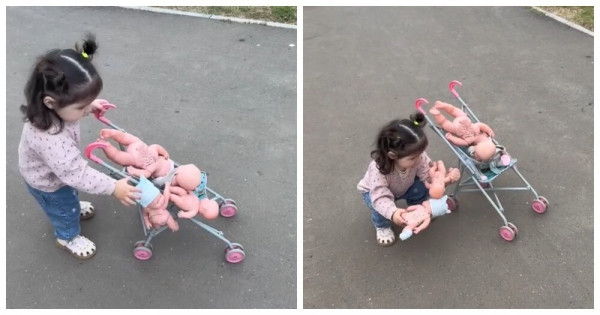 Прогулка превратилась в выпуск новостей: маленькая хозяйка коляски ведёт переговоры с кукольным парламентом. Мест свободных нет, а желающих слишком много.
