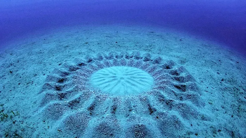 Разгадка пришла лишь в 2011 году, когда подводный фотограф, снимавший эти круги, совершенно случайно запечатлел и самого "автора" проекта. Присмотритесь к снимку: в самом центре конструкции, примерно на позиции "три часа", вы увидите настоящего творца.