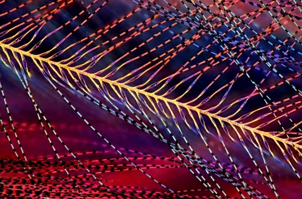 Пуховые перья большой синицыПуховые перья большой синицы состоят из волокон, которые работают как природная дифракционная решетка, обеспечивая переливание всеми цветами радуги.