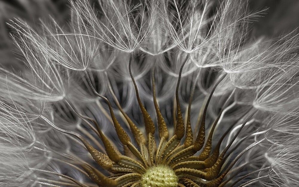 Семенная головка цветка крестовникаИзящная структура соцветия крестовника, заполненная крошечными семенами. У каждого семечка есть пушистый хохолок, который в будущем поможет ему отправиться в воздушное путешествие и, если повезет, попасть в благоприятные условия для прорастания и воспроизводства собственного потомства.