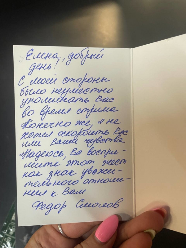 "С моей стороны было неуместно упоминать Вас во время стрима. Конечно же, я не хотел оскорбить Вас или Ваши чувства. Надеюсь, Вы воспримите этот жест как знак уважительного отношения к Вам", - написал Смолов в записке к букету.