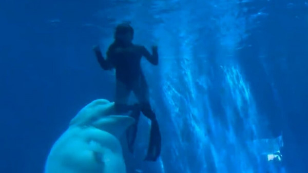 Кит-белуха по неизвестной причине решил покусать дайверов в аквариуме в Китае.