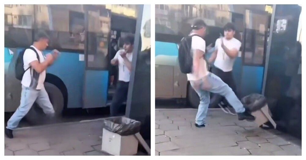 В Подмосковье двое мужчин решили выяснить отношения на остановке. Один из них внезапно сменил цель и ударил по урне, чем воспользовался соперник.