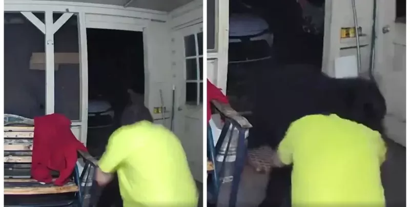 Схватка между зверем и человеком длилась несколько секунд, после чего владелец дома вытолкал медведя голыми руками и с помощью пластикового ведра.Через мгновение американец додумался схватили тяжелую скамейку и перекрыть вход для незваного гостя, чтобы тот не смог снова напасть.