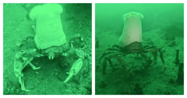 Дайверы запечатлели забавную сцену. Краб "надел" на себя анемону для маскировки и стал напоминать подводного шеф-повара.