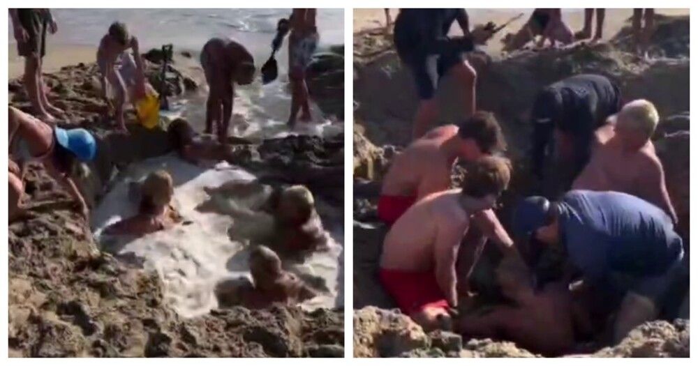 Подростки выкопали большую яму на пляже, в которую затекала вода из моря. Юнцам было весело, пока они не поняли, что не могут выбраться.