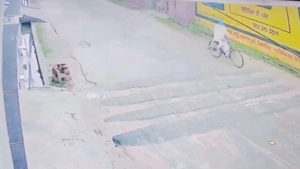 60-летний фермер Джагдживан Сингх ехал на велосипеде по деревне Джавахарке в Индии, когда вдруг на него обрушилась часть стены. Момент попал на видео.