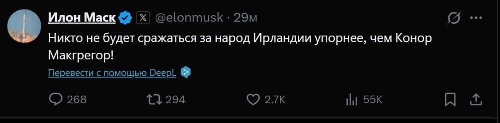 Тем временем Илон Маск поддержал кандидатуру Макгрегора. Выборы президента Ирландии состоятся через полтора месяца - 24 октября. Кандидатам на пост президента необходимо необходимо получить номинации от 20 членов парламента или четырёх окружных/городских советов до 24 сентября. Успеет ли Макгрегор собрать необходимую поддержку - неизвестно. Он запустил петицию с требованием изменить эти правила, настаивая на том, что они блокируют демократическое участие. После своего заявления публичной поддержки от политиков он не получил. Эксперты сомневаются в его шансах на победу в выборах из-за предвзятости системы в отношении известных деятелей.