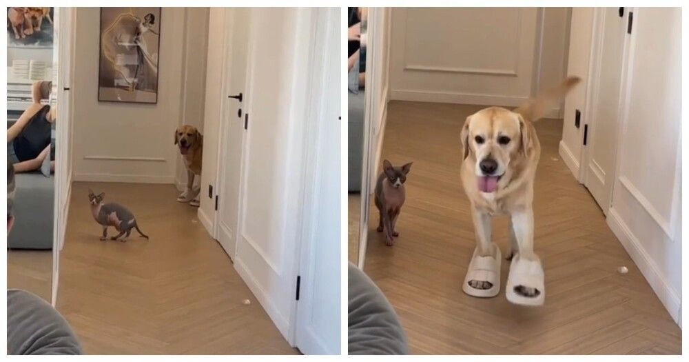 Хозяин попросил собаку Дени принести тапки, и пес воспринял просьбу слишком буквально - надел их на передние лапы и гордо принес хозяину в гостиную.