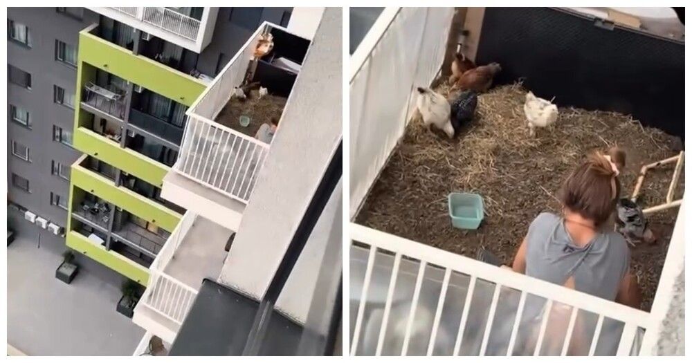 В одном из жилых комплексов местная жительница решила завести кур прямо у себя на балконе. Для птиц она оборудовала небольшой курятник с кормушками и сеткой. Соседи отмечают, что по утрам из-за криков и кудахтанья пернатых стало не так комфортно, как раньше.