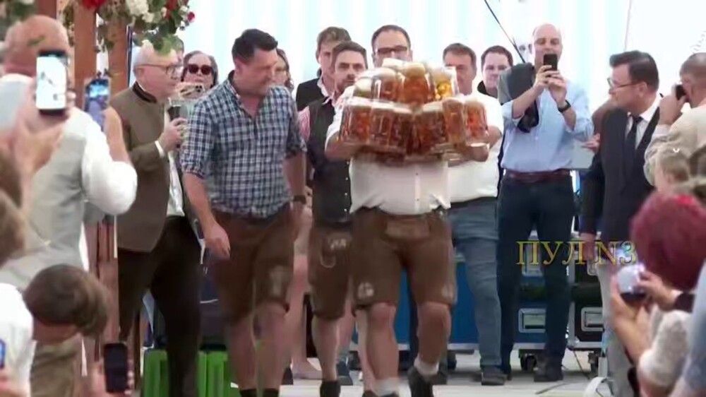 Житель Германии попытался установить мировой рекорд по переноске пивных кружек.