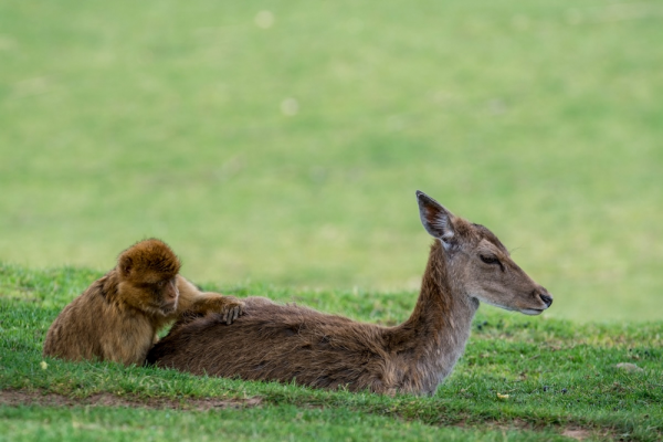 Вторая причина катаний - груминг. Учёные постоянно наблюдают, как обезьяны запрыгивают на оленей, гладят их и перебирают шерсть. Однако, не стоит путать это поведение с таковым у птиц-чистильщиков, которые садятся на крупных животных, чтобы покушать с них паразитов. Да, в шерсти рогатых могут быть вредители, и обезьяны даже могут их убрать и/или съесть, но они не ищут блох-клещей целенаправленно. Груминг макак носит скорее социальный характер, так они "общаются" с копытными, успокаивая их и себя самих заодно. Для социальных приматов очень важно тактильное взаимодействие с сородичами. С оленями они показывают похожее поведение.