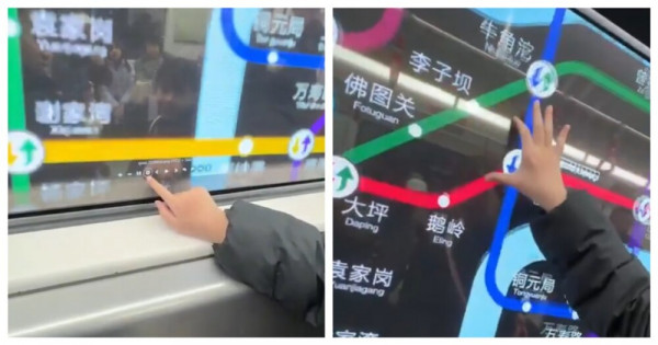 Жители Китая демонстрируют сенсорный дисплей-карту на окне поезда в метро.