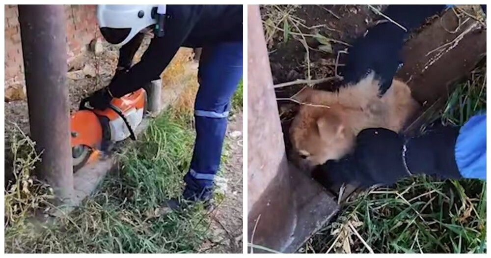 Любопытный щенок забрался в узкую металлическую трубу под крыльцом завода и застрял. К счастью, его вовремя обнаружили.