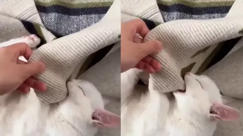 Кот уснул прямо в процессе кусания пледа. Его маленькие зубки застряли в мягкой ткани.