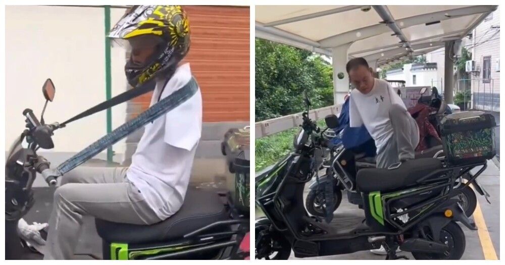 Очевидцы сообщили, что он прикрепил тросы к рулю, перекинул их через плечи и управляет поворотами, двигая корпусом. Также мужик не только ездит сам, но и без посторонней помощи снимает шлем, кладёт его в багажник и ставит электромопед на зарядку.
