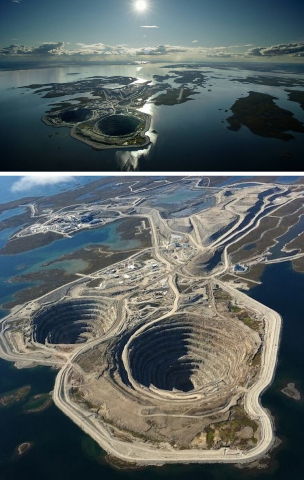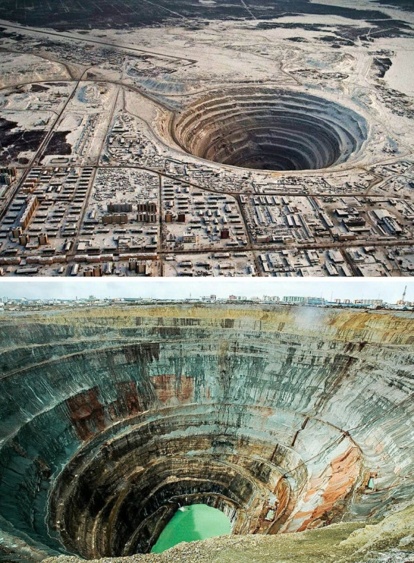 Глубина карьера составляет 735 метров, его диаметр - 1,4 километра. Месторождение было открыто в 1955-м году.