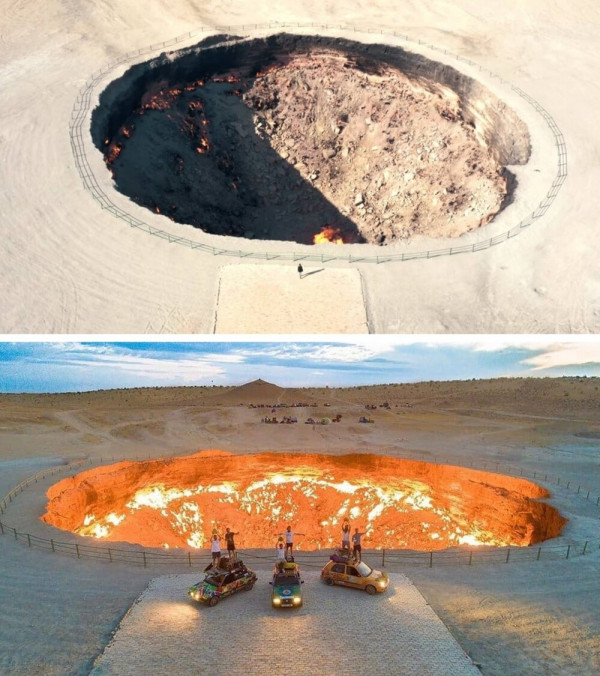 Этот постоянно горящий с 1971-го года кратер часто называют "Вратами в ад". Его глубина достигает 20-ти метров, а диаметр - 60 м.