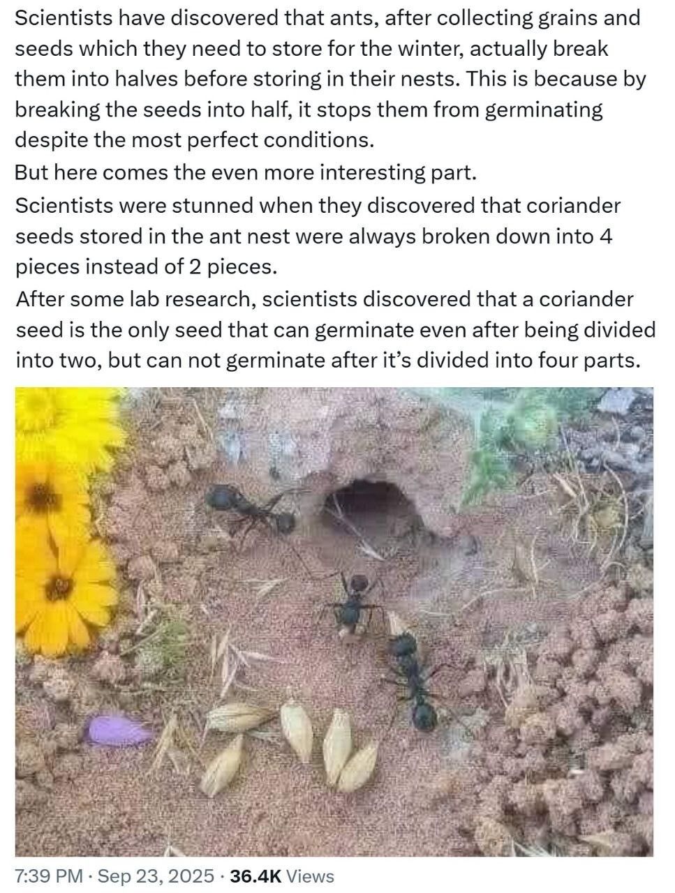 Это потому что разбитое на две части зернышко никогда не прорастет, даже если поместить его в идеальные для этого условия, а в муравейнике как раз идеальные.Но затем ученые увидели, что семена кориандра муравьи всегда раскалывают не на две, а на четыре части. Они заинтересовались этим и в лабораторных условиях выяснили, что кориандр - единственное растение, зерна которого могут давать ростки даже в том случае, если их расколют надвое. Но если на четыре части, тут уже всё - фаталити.