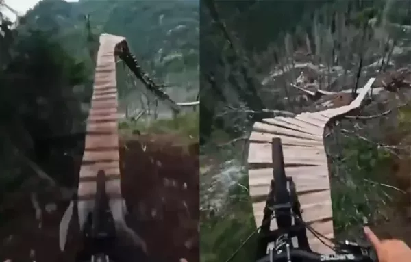 Норвежский райдер Браге Веставик доказал, что для него не существует слова "невозможно". Он пролетел на велосипеде по самой экстремальной велотрассе в его жизни, которая выглядит как дорожка из самых страшных ночных кошмаров при температуре 38.Другой ракурс.