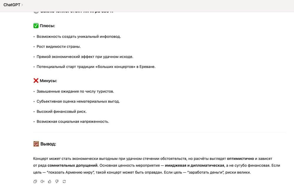 Armenian Global Community тоже выполнили анализ трат с помощью ИИ, и выяснили, что выгоды от концерта могут показаться не столь оптимистичными.