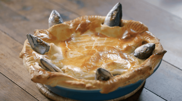 Это пирог из сардин, картофеля и яиц. Главная его особенность в том, что сардины остаются целыми, а их головы выглядывают из корки пирога. Рыбины как будто смотрят на звёзды (отсюда и название: star - звезда, gaze - пристально смотреть). Вместо сардин можно использовать любую белую рыбу.